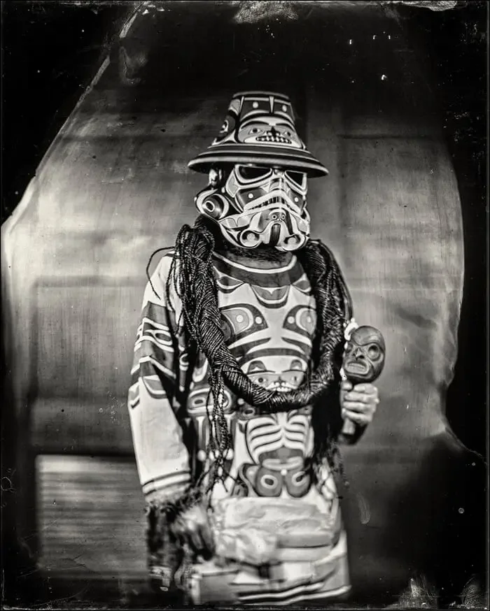 Like in the photograph above, the photographs made by Wilson complicate our understandings of what it is to be Native within the photographic archive– the answer to that is unique to everyone who chooses to participate. Through the use of Curtis’ techniques, Wilson puts the images in dialogue with those of the past. Both the photographer and the photographed resist the “vanishing Indian” and the simplification inherent to the colonial photograph. Time passes– the stormtrooper influence above shows us that indigenous people are surviving and adapting despite colonialism. They are here in the present, not back in Curtis’ ethnographic images. Wilson also allows them to speak in his “talking tintype” project, where collaborators are able to make change within the archive itself. They’re able to show themselves and tell their own stories. Such is the power of the indigenous photograph. Imagine if Angeline could have reached us through the frame to speak to us– of what mattered to her, of who she was, of what made her angry, and of why she decided to stay. Cole writes that “photography writes with light, but not everything wants to be seen. Among the human rights is the right to remain obscure, unseen and dark” or at the very least, seen in one's own light.